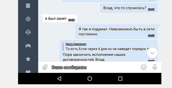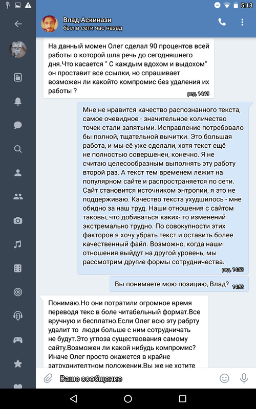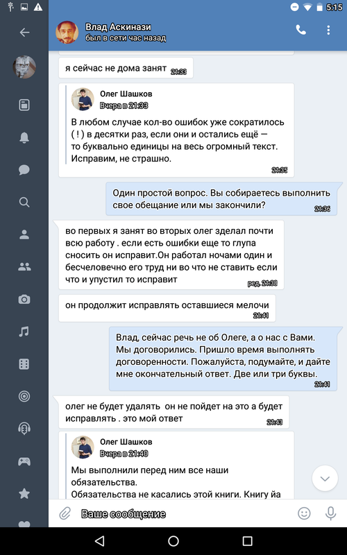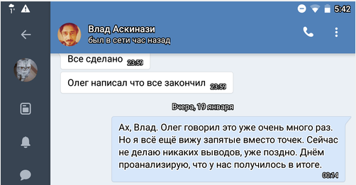 На мой взгляд, эта история не даёт оснований в чём-то обвинять Олега. Я имел дело только с Владом, и не знаю, что происходило с другой стороны разговора, может быть тоже что-нибудь не менее возмутительное. Мы это вряд ли узнаем.